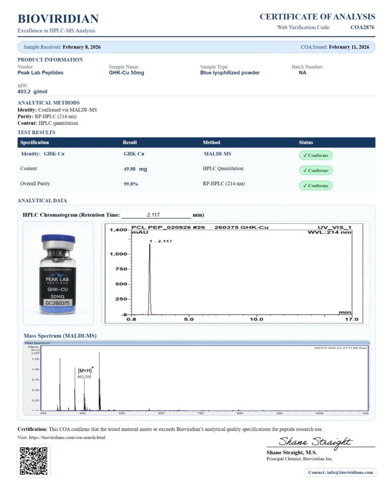 TB-500 is a synthetic Thymosin Beta-4 fragment studied in preclinical models for its roles in actin-binding dynamics, cell migration, angiogenesis, and tissue repair signaling. Supplied as lyophilized powder at 99%+ HPLC verified purity. Batch-specific COA included. For in vitro research use only.